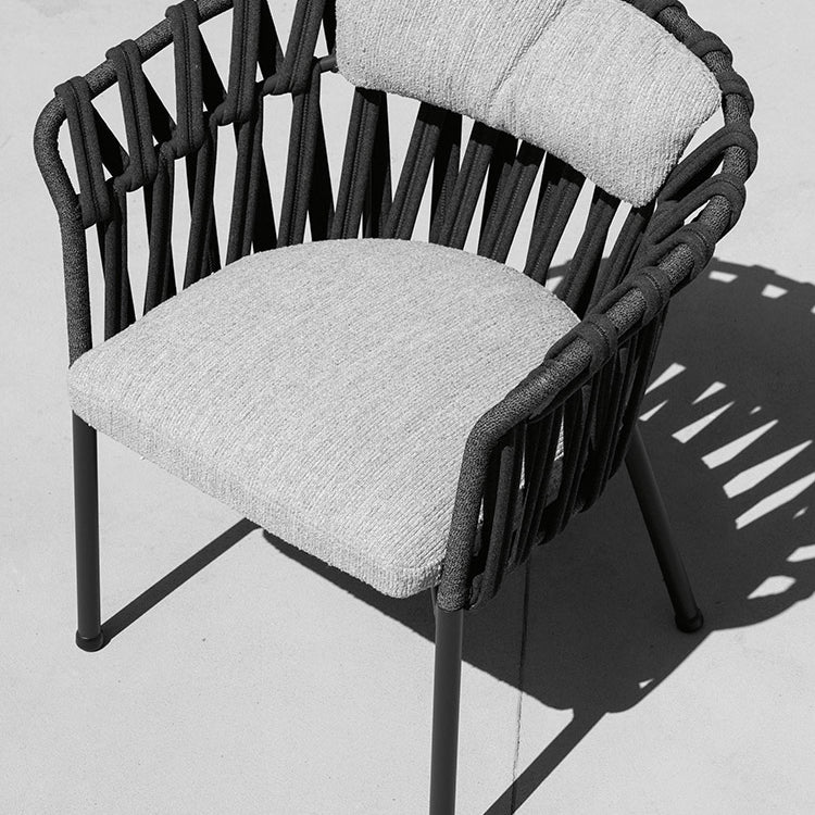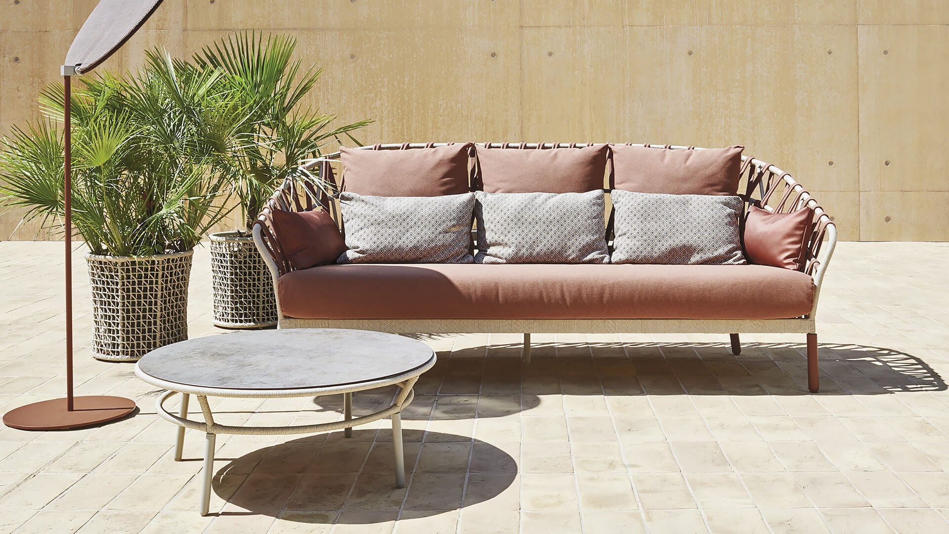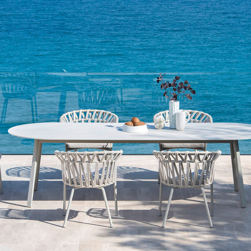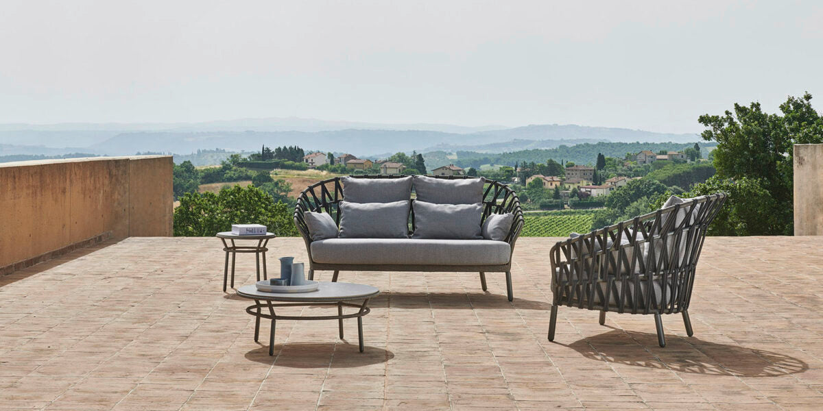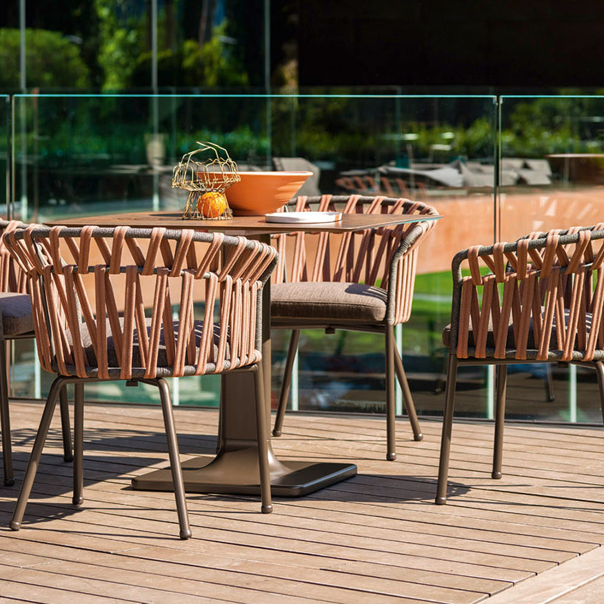 Lines inspired by the corolla of a flower and the collar of a shirt, marked by the interlacing, refined essential in acrylic fabric band. The slender, powder-coated aluminium structure combines lightness and robustness. Completing the recipe of perfect relaxation outdoor are seat and optional back cushion in fabric, padded with rubber Dryfeel® for outdoor use.