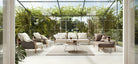 The Isamu Collection is available in different-sized sofas, armchairs and chaise longues for the living area, plus tables and chairs for the dining area, creating a complete collection, suitable for any outdoor space. It is partially decorated with an outdoor mesh upholstery to create a mixture of materials, refined finishes and colours.