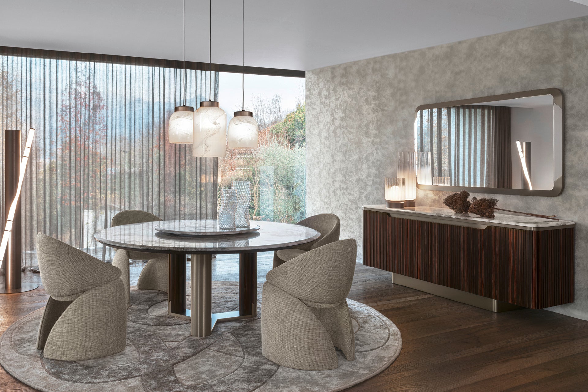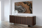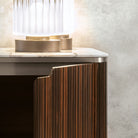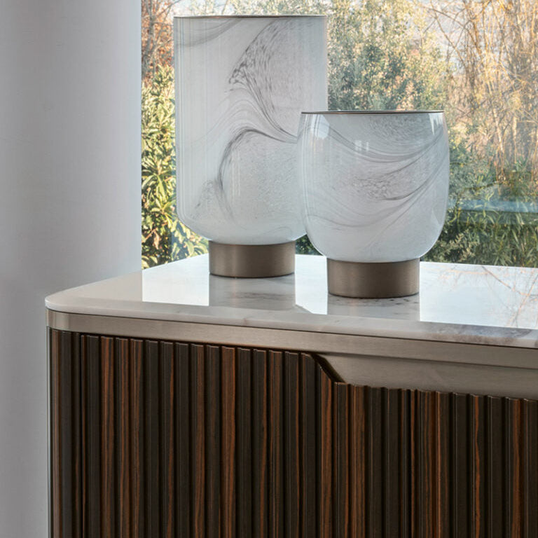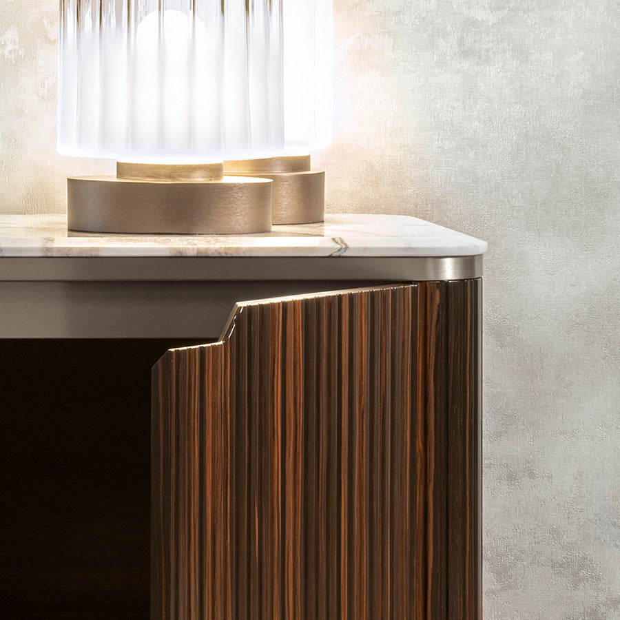 Buffet with 4 doors in ribbed satined Makassar Ebony veneer. Bevelled top in high gloss finish, Namibian Oyster marble. Base and details in satined galvanized titanium finish stainless steel. 1 interior full extension drawer with front in satined Makassar Ebony veneer, bottom part in velvet fabric. 3 adjustable tempered glass shelves.