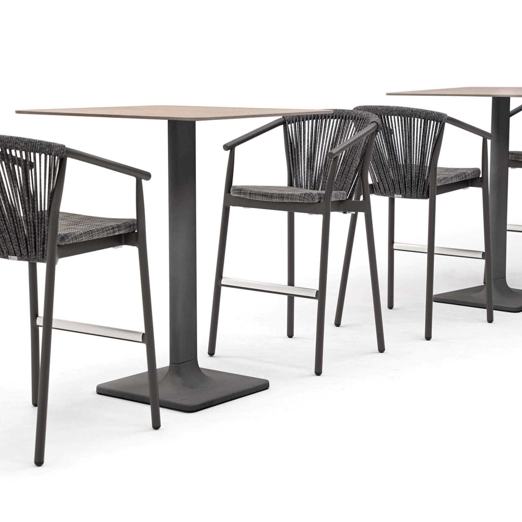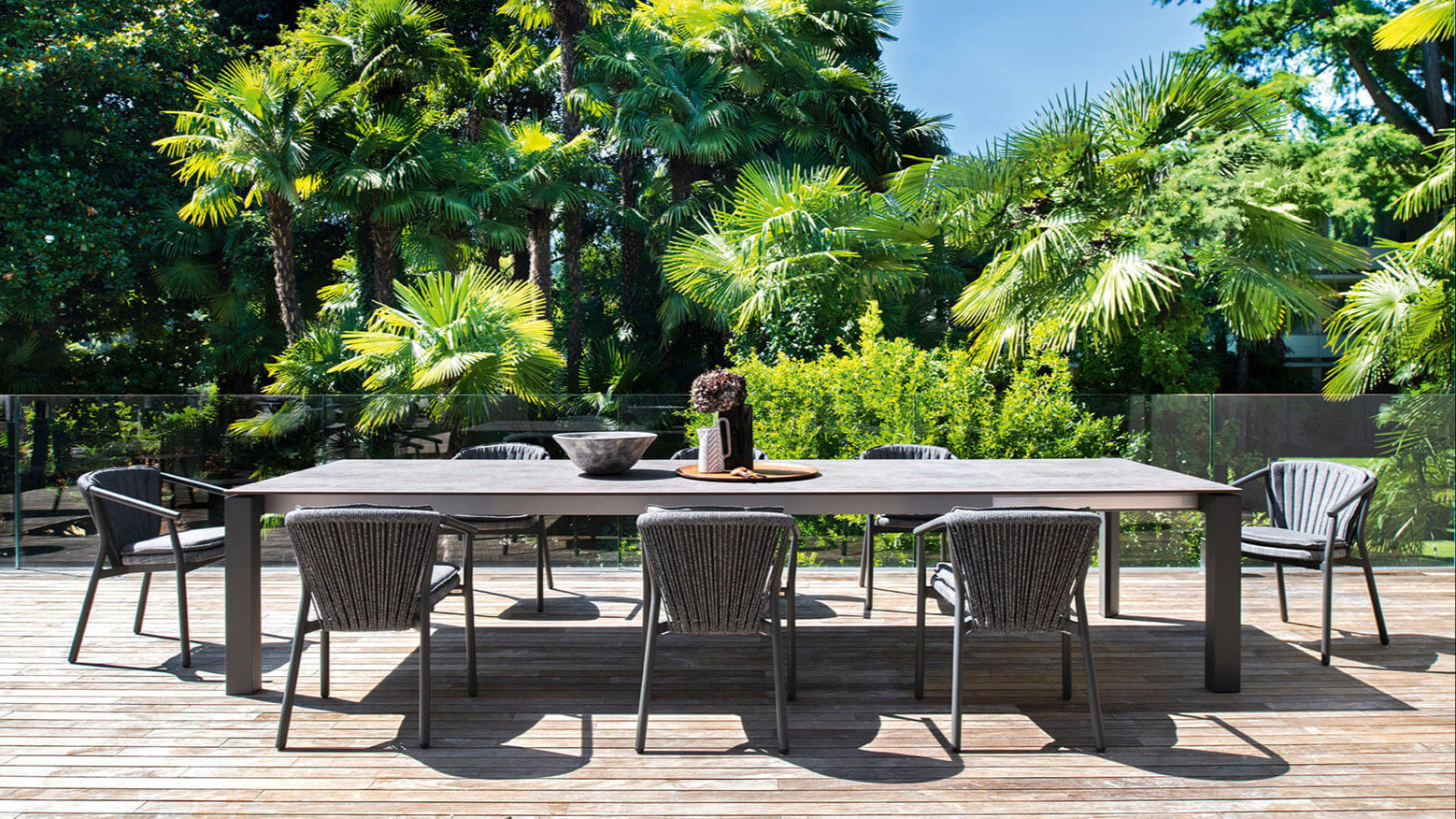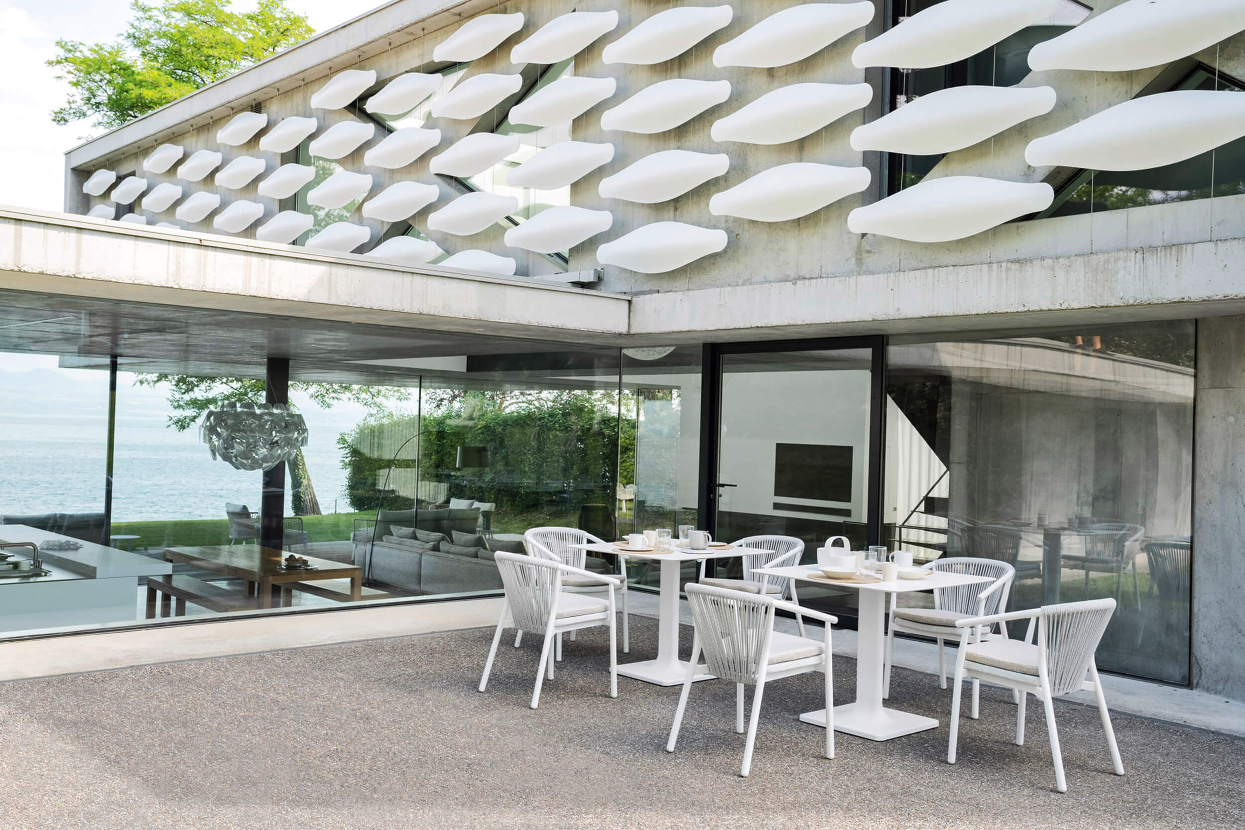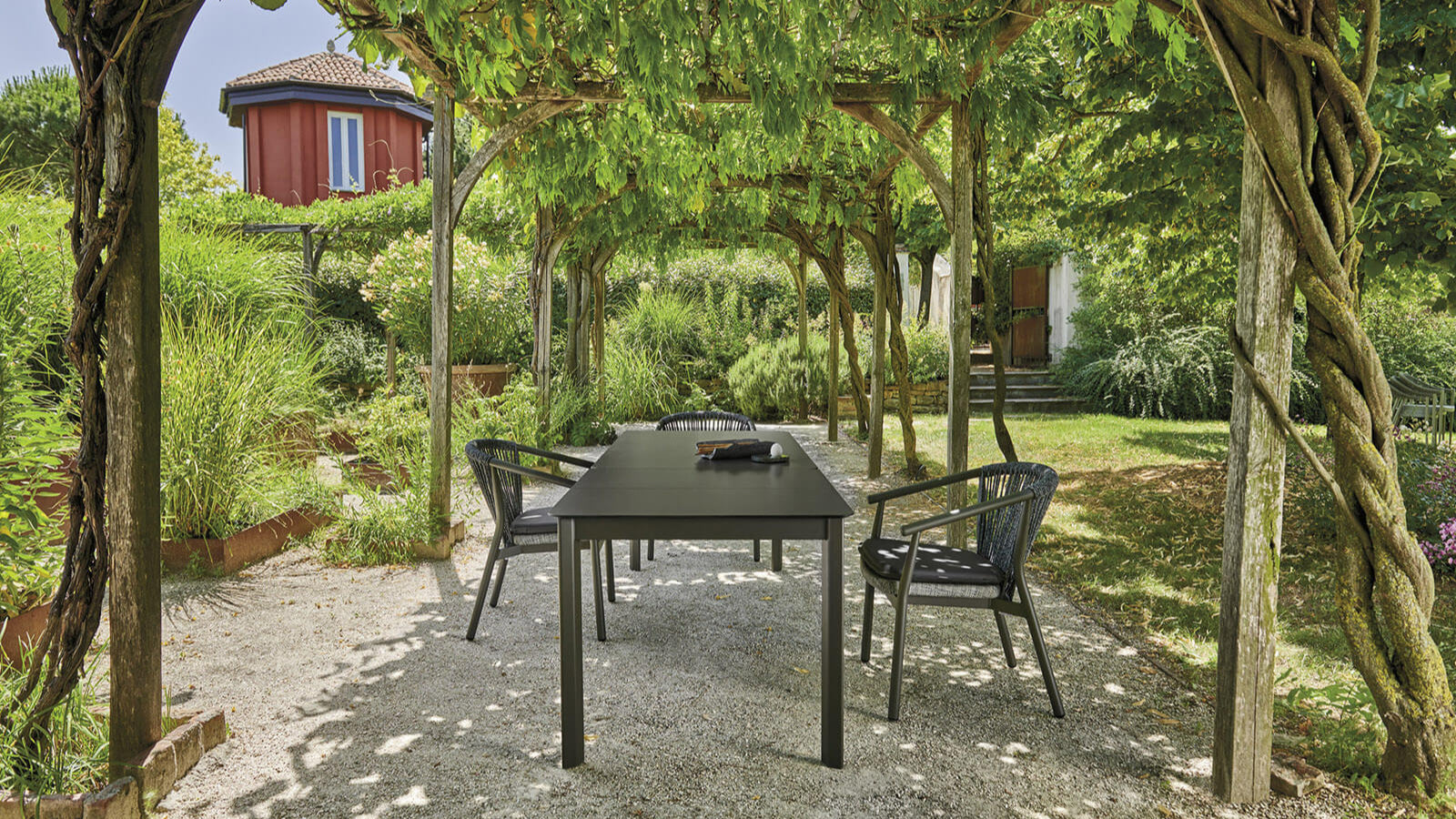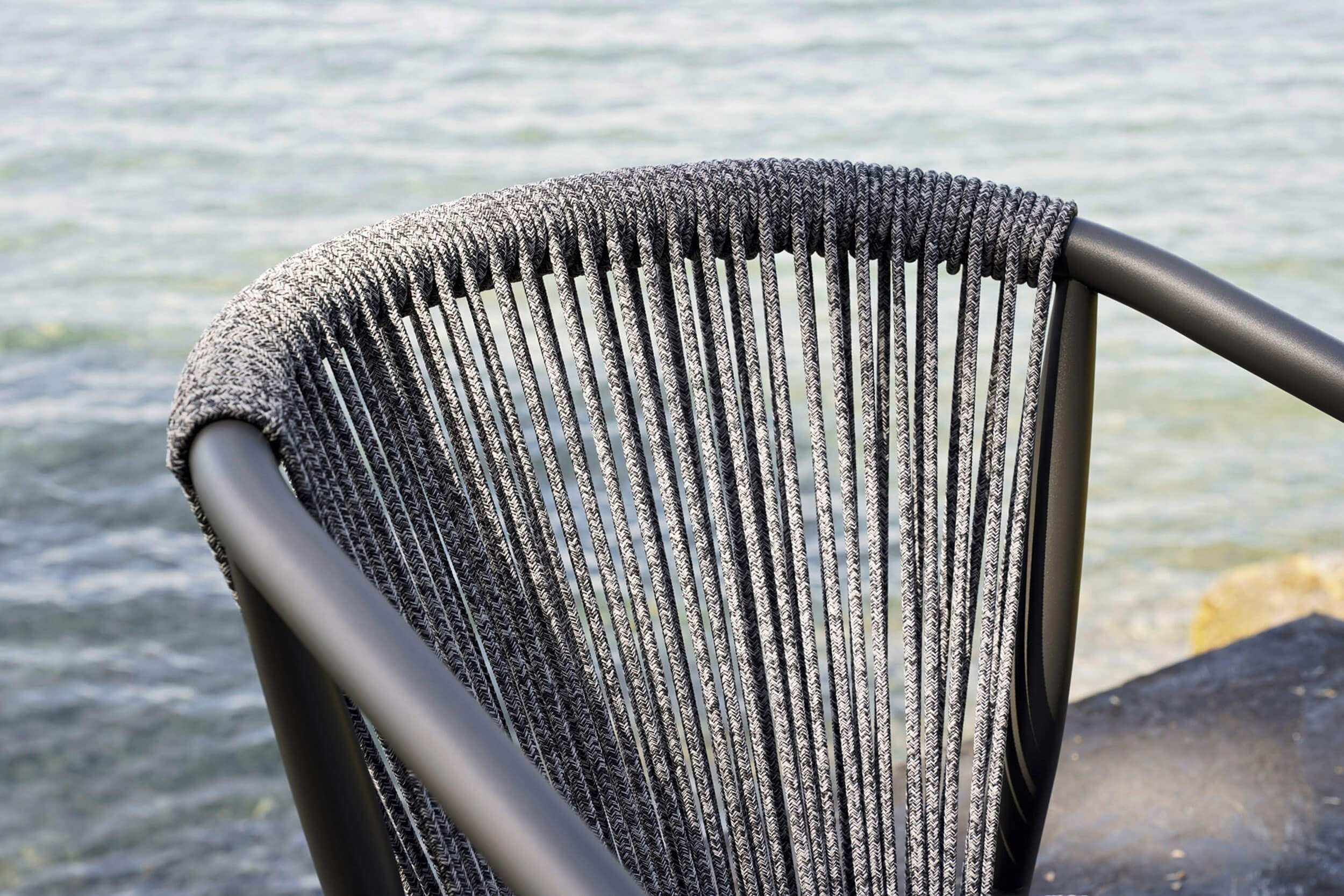 The design of the Smart armchair comes from the perfect balance between the enveloping curve that outlines the backrest and the dynamic verticality of the weave in synthetic VAR # TEX rope.