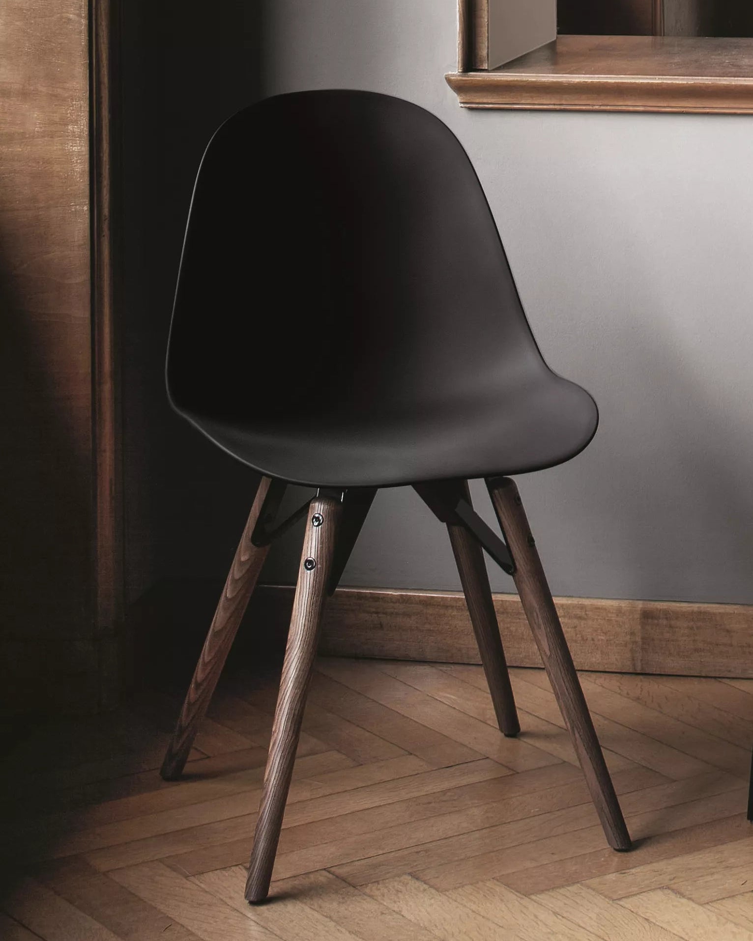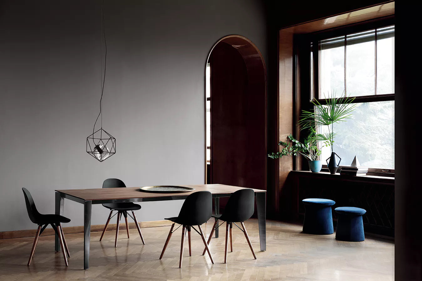 A contemporary statement in affordable luxury furniture, the Mood Lined dining chair is designed and Made in Italy, blending modern form with everyday functionality. Its lacquered metal frame features distinctive triangular legs with a refined round section, creating a clean and architectural silhouette suited to contemporary dining interiors.
