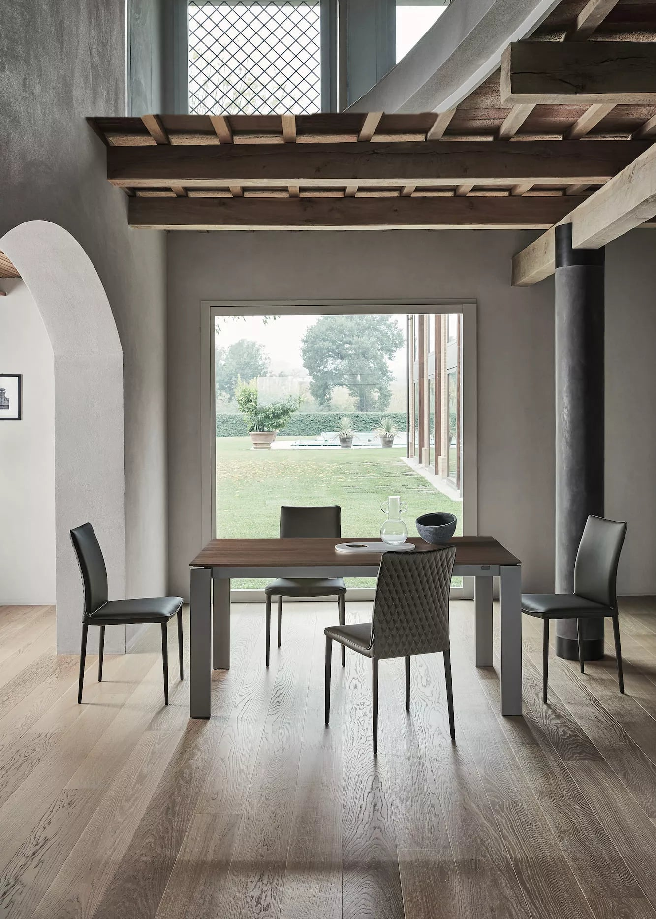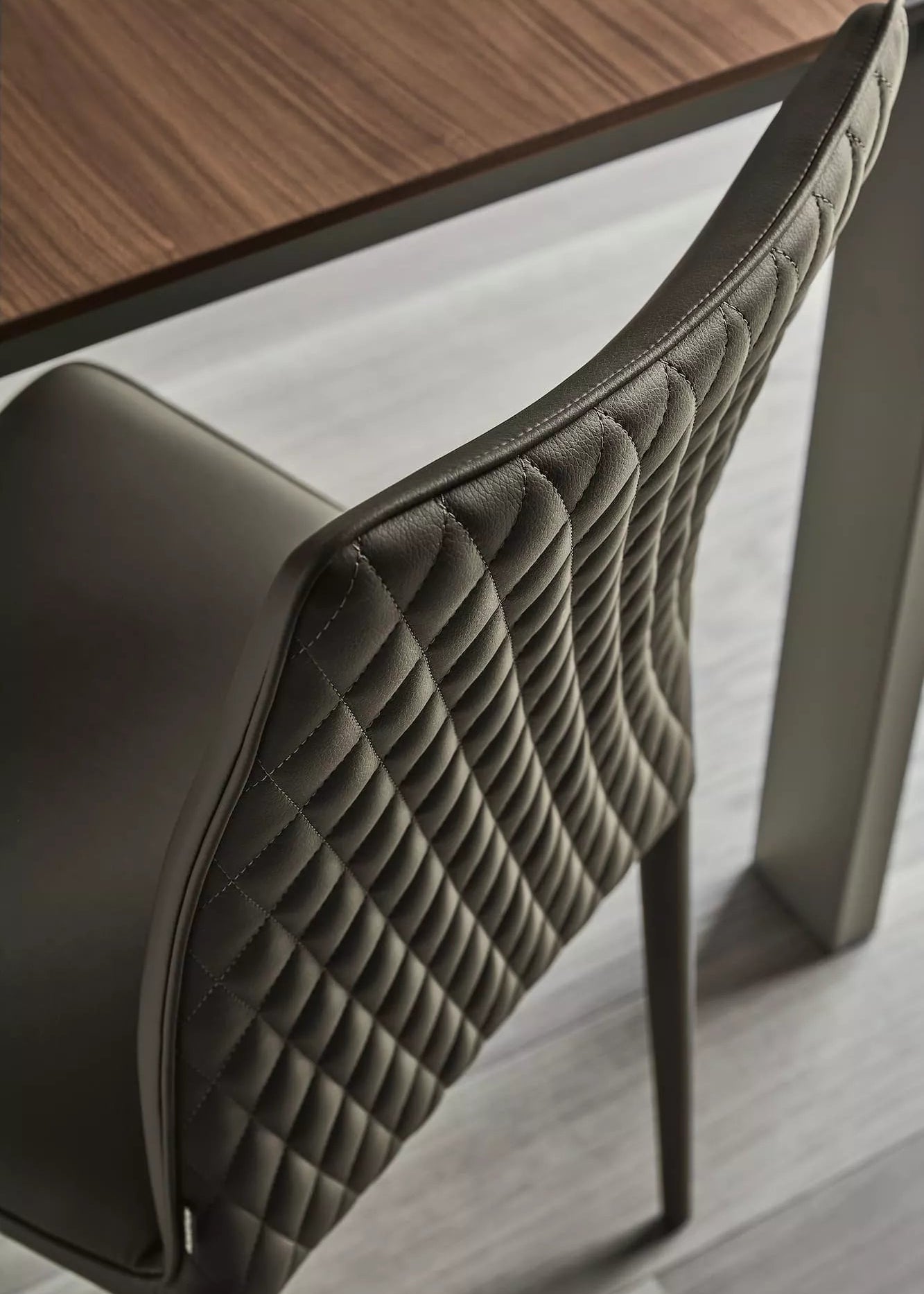 A quilted backrest option is also available in Nordic fabric, Eco Leather, and Premium Nappa Leather, enhancing the chair’s identity as a contemporary Italian luxury dining chair.
