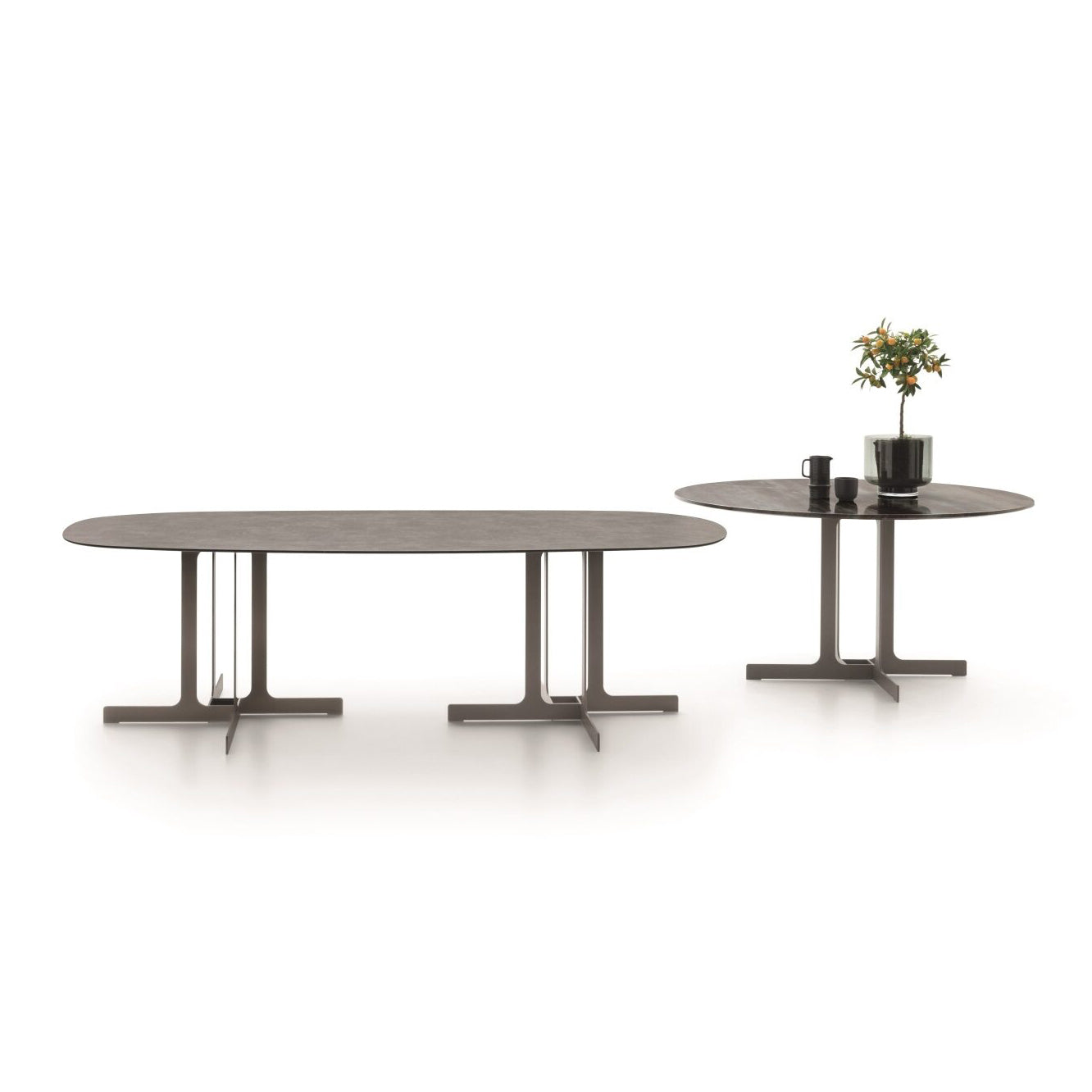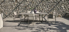 The Nell Dining Table is a collection of tables with a contrasting top resting on an extremely light frame. The fine, thin metal blades of the base allow it to be used either separately or in pairs.