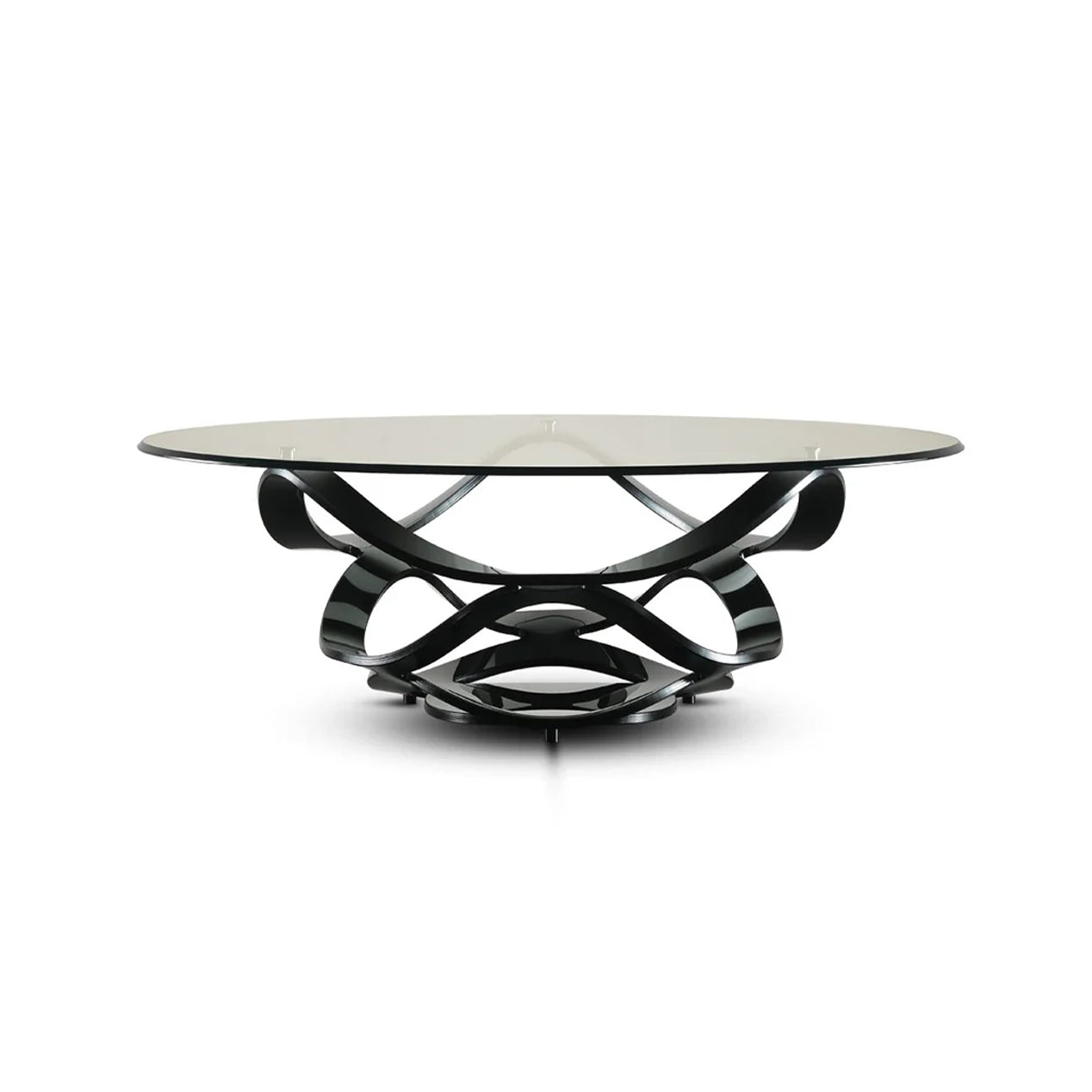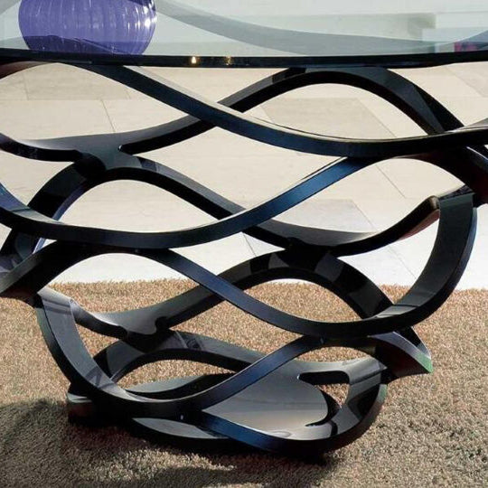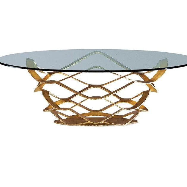 The stunning and absolutely beautiful dining table with featuring round base in curved glass in transparent, black lacquered finish, brass or dark brass finish, titanium or dark titanium finish or in the newest finish which is the gold or silver leaf. Also available in extra clear glass.