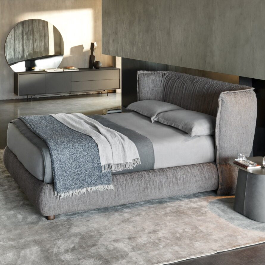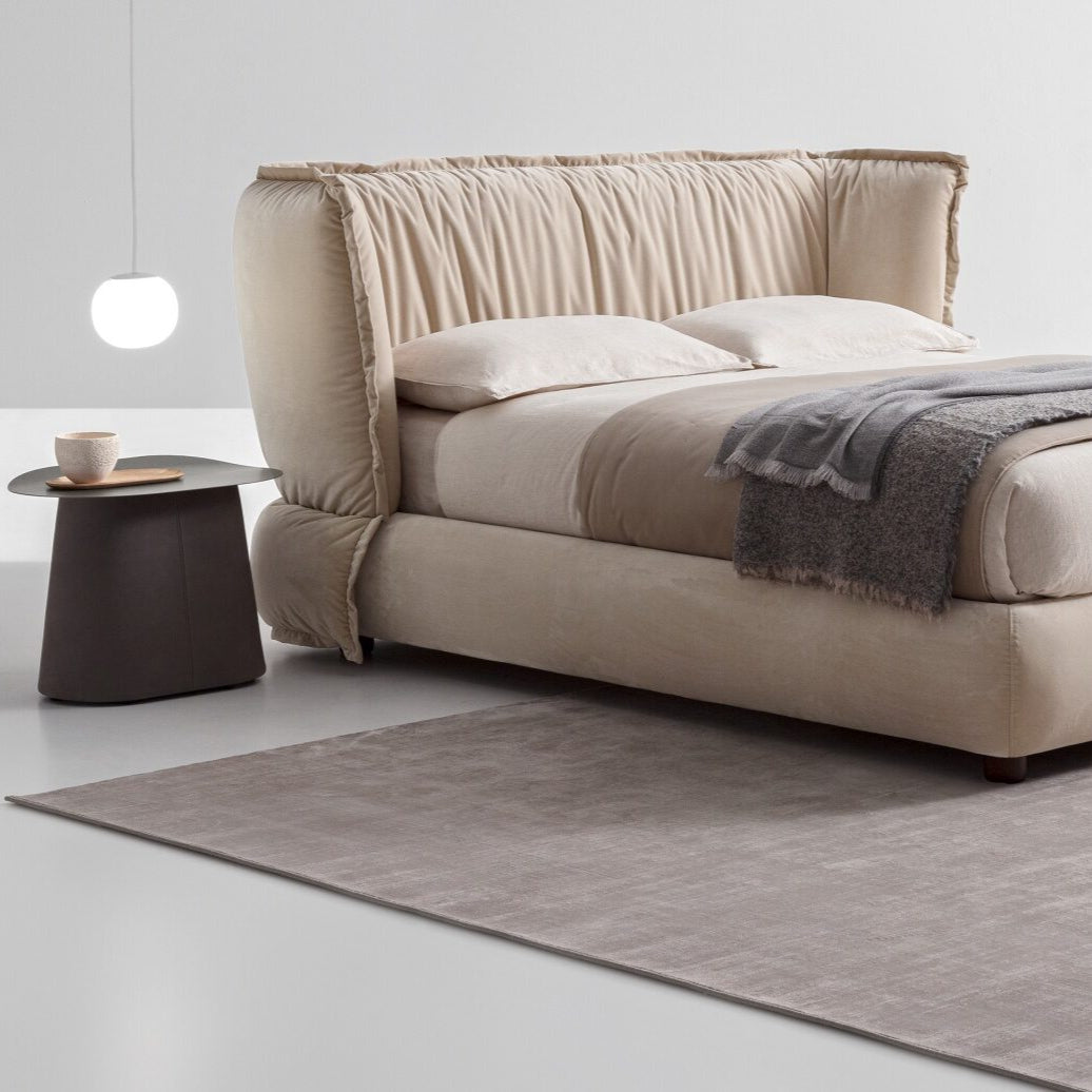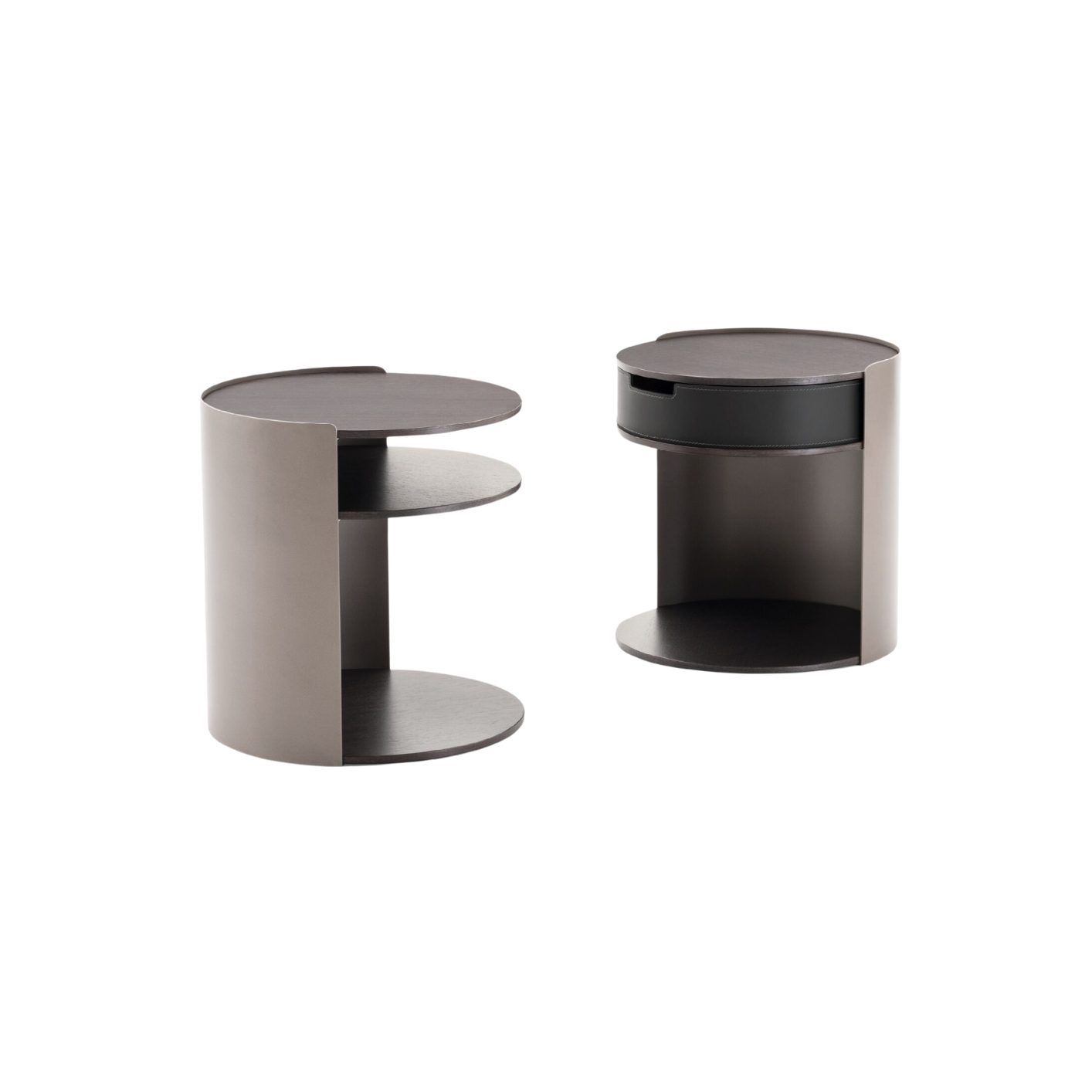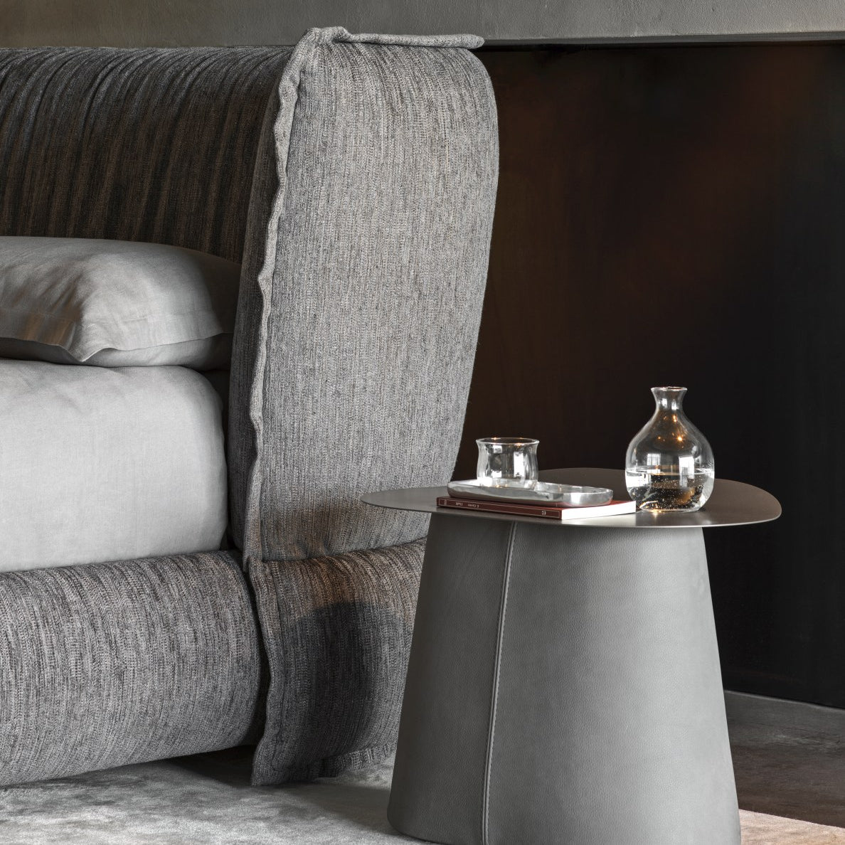 The Puppet bedside emphasises its stark and disciplined shape, dictated by a metal surface and solid base upholstered with leather or fabric. Available in multiple finishes.