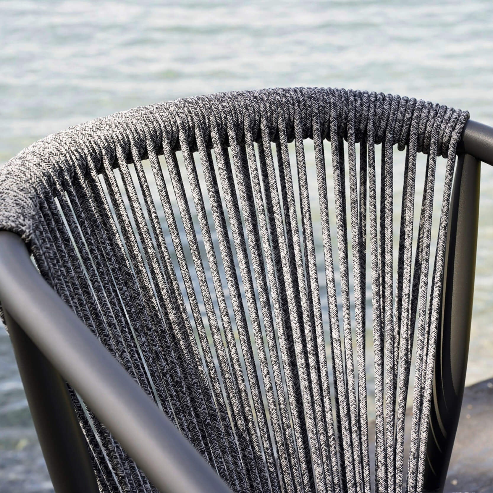 Available with white structure, white seat and white rope backrest, or with grey structure, ash grey seat and ash grey rope backrest, or with metal bronze structure, bronze seat and bronze rope backrest.