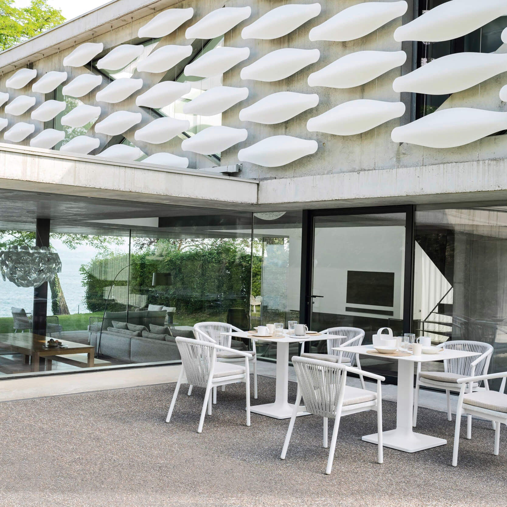 The slender design of the Smart stool takes shape from the perfect balance between the enveloping curve that outlines the backrest and the dynamic verticality of the VAR # TEX synthetic rope weaving. Light, easy to handle and extremely resistant, these seats are best suited to the needs of outdoor contract spaces, since they can be stacked and easily transported or stored.