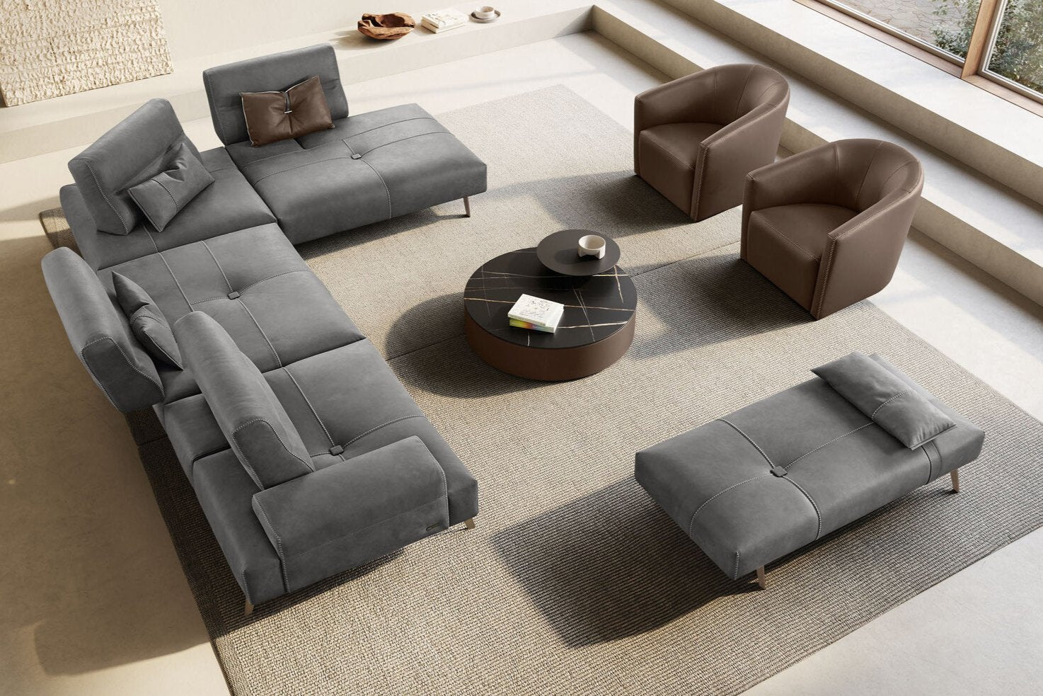 Leather coffee table with a swivelling tray on the top. An astonishing piece of design. The frame has been expertly covered in leather with deft topstitching to define its rounded silhouette. The tiered effect of the surfaces is accentuated by the finishes of mirrored bronze and mirrored smoke on the top tray; the bottom table is available in all the other finishes in our collection.