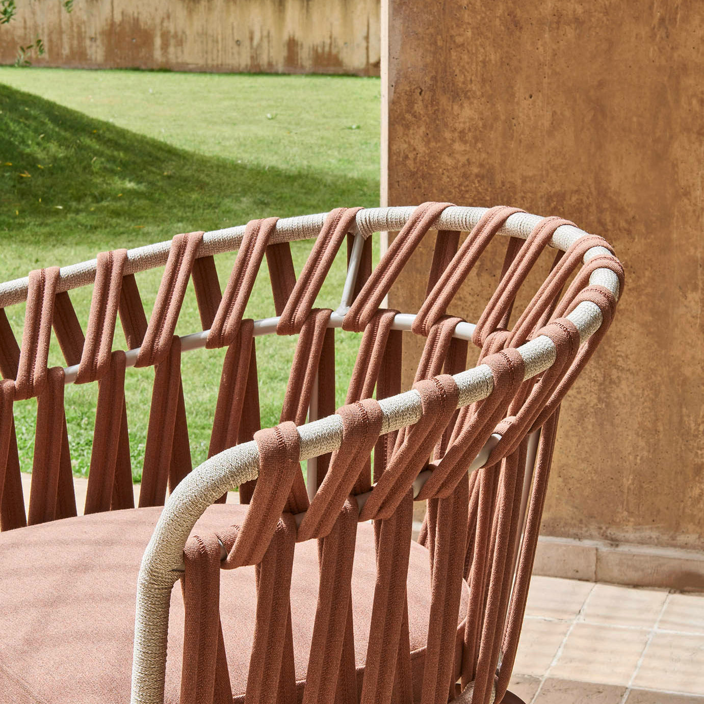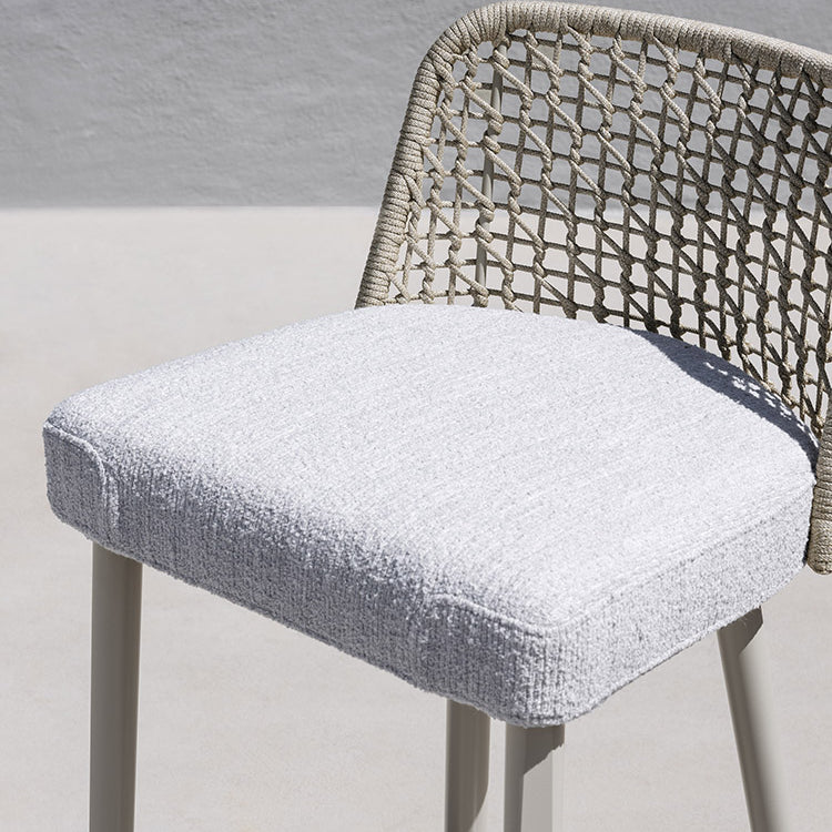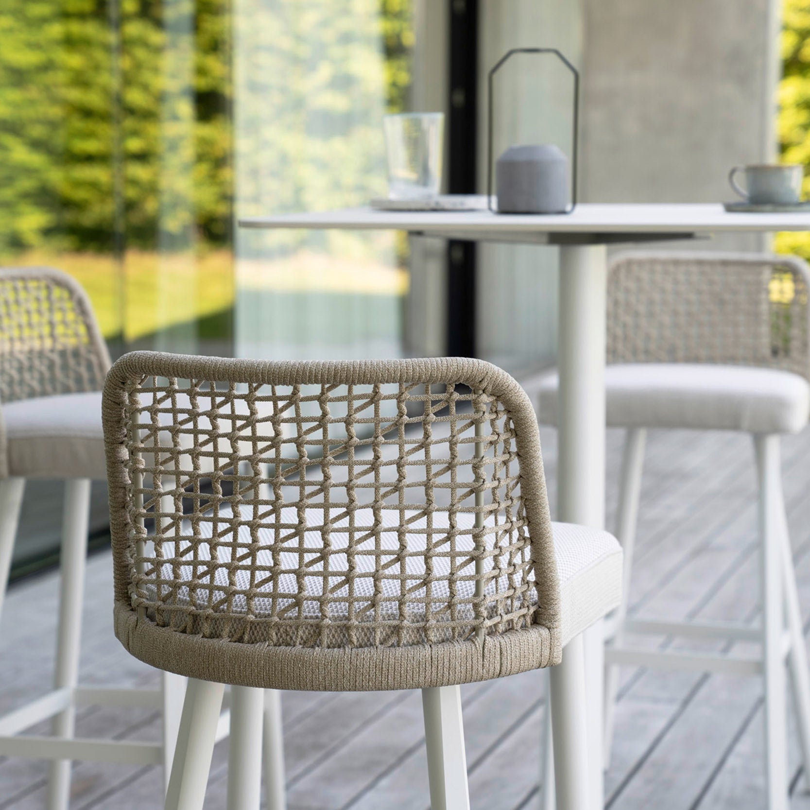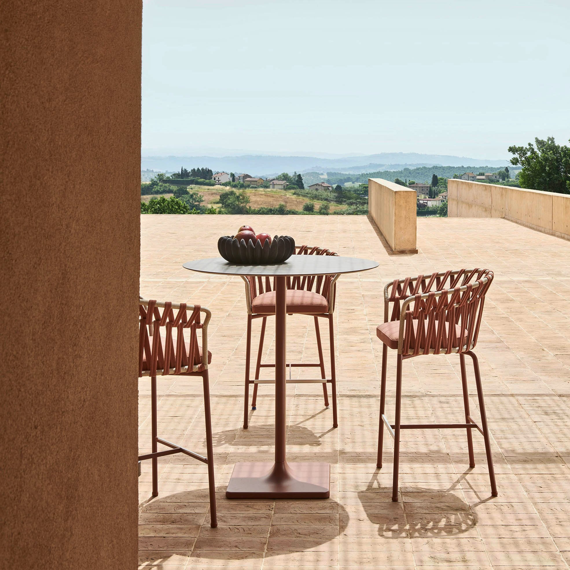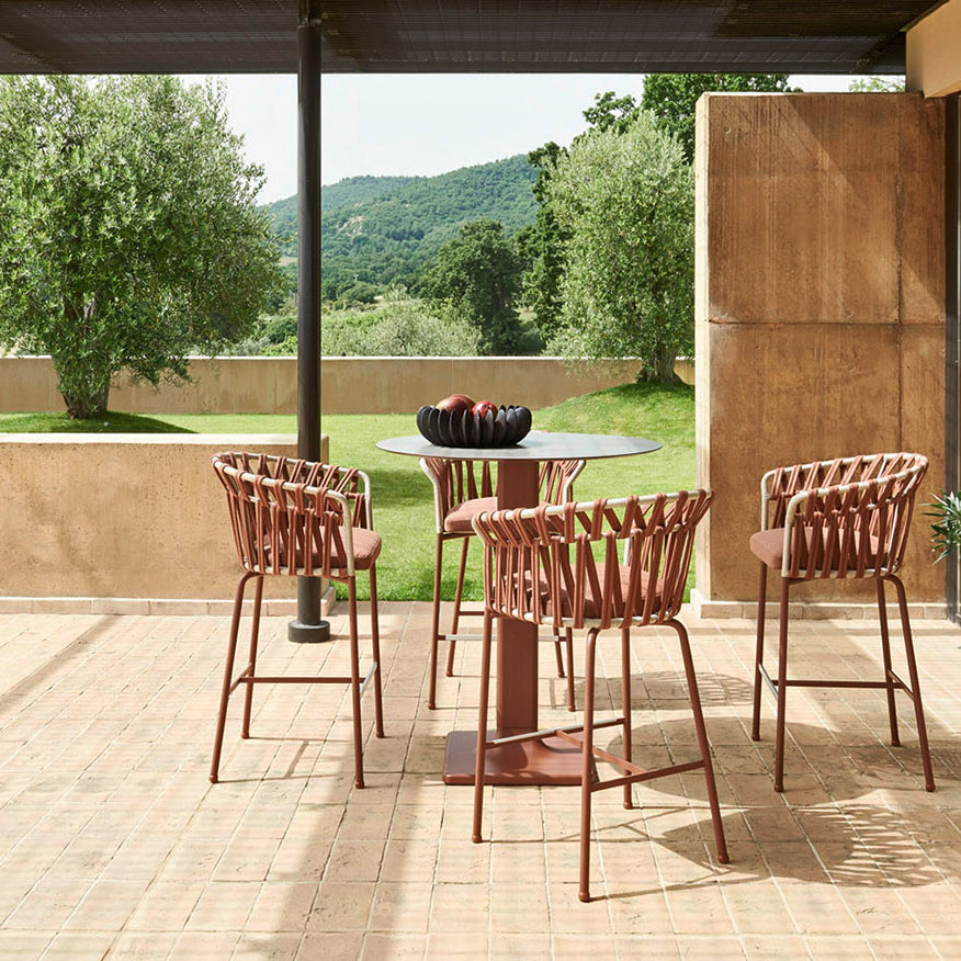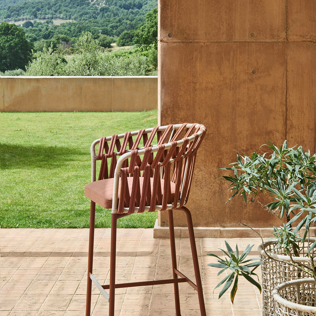 The steel rod structure of the Summer Set stool gives shape to a curved lattice with ergonomic lines, made even more welcoming by a soft cushion.
