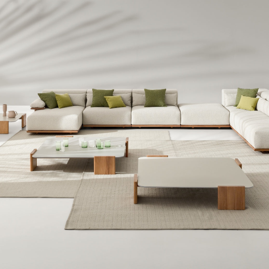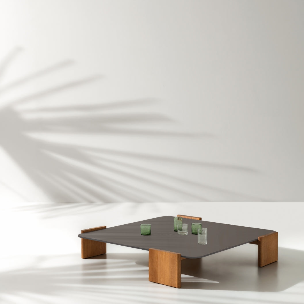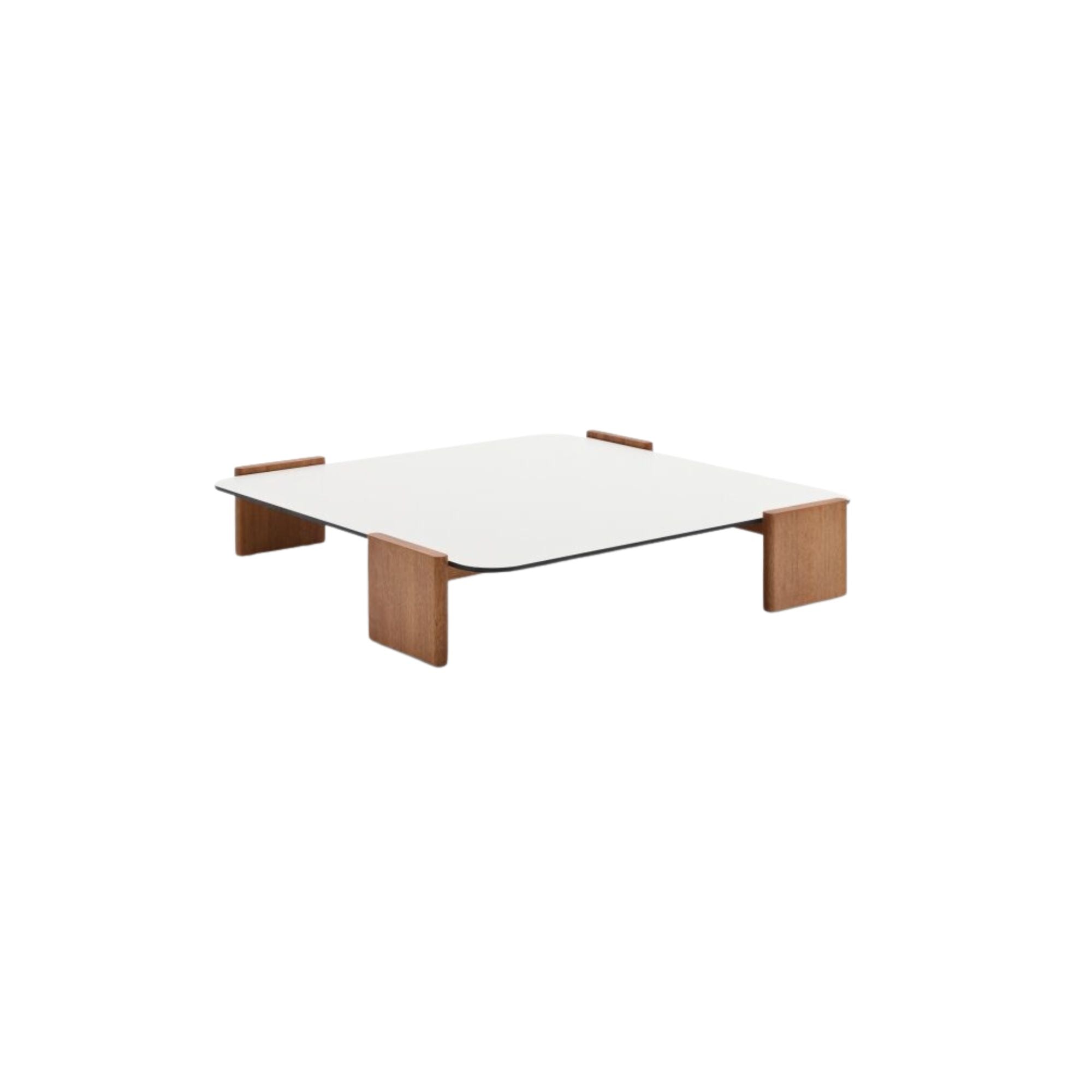 Coffee tables with a marble, stoneware or hpl top and wood iroko legs.