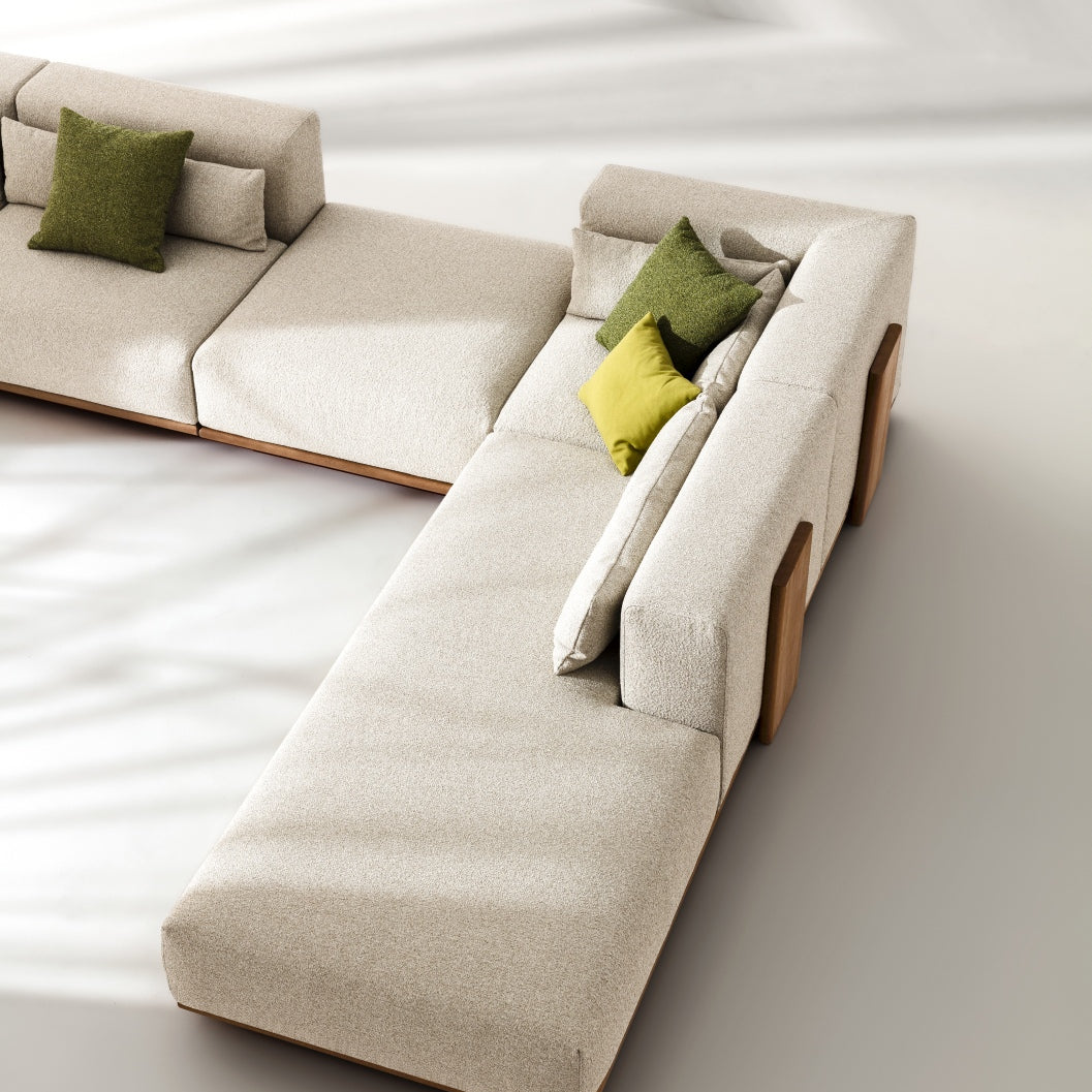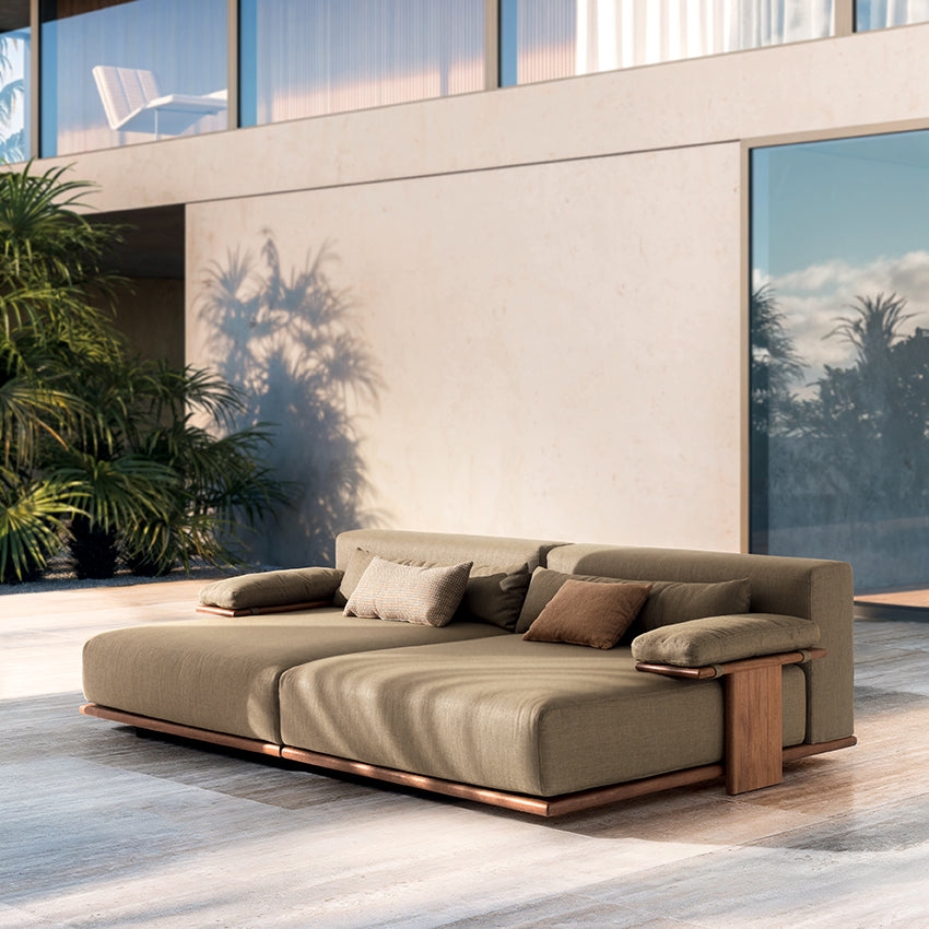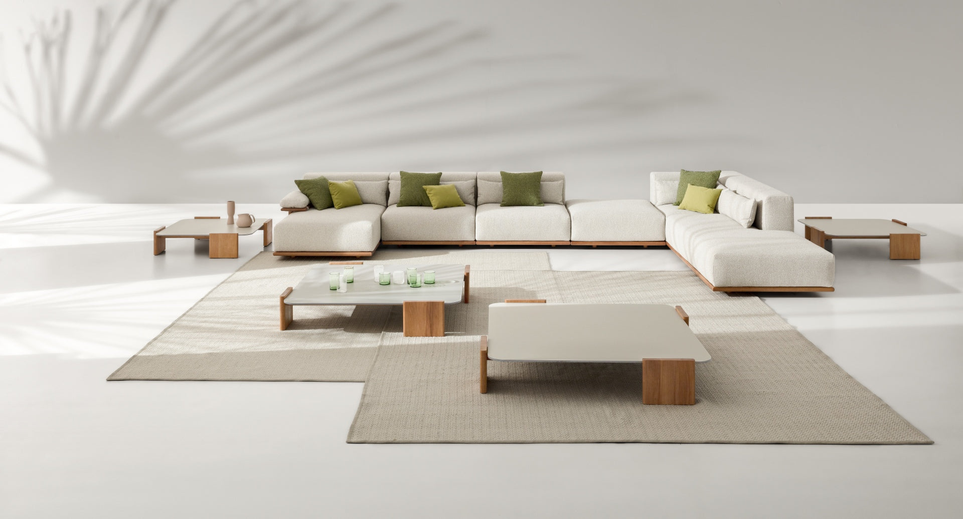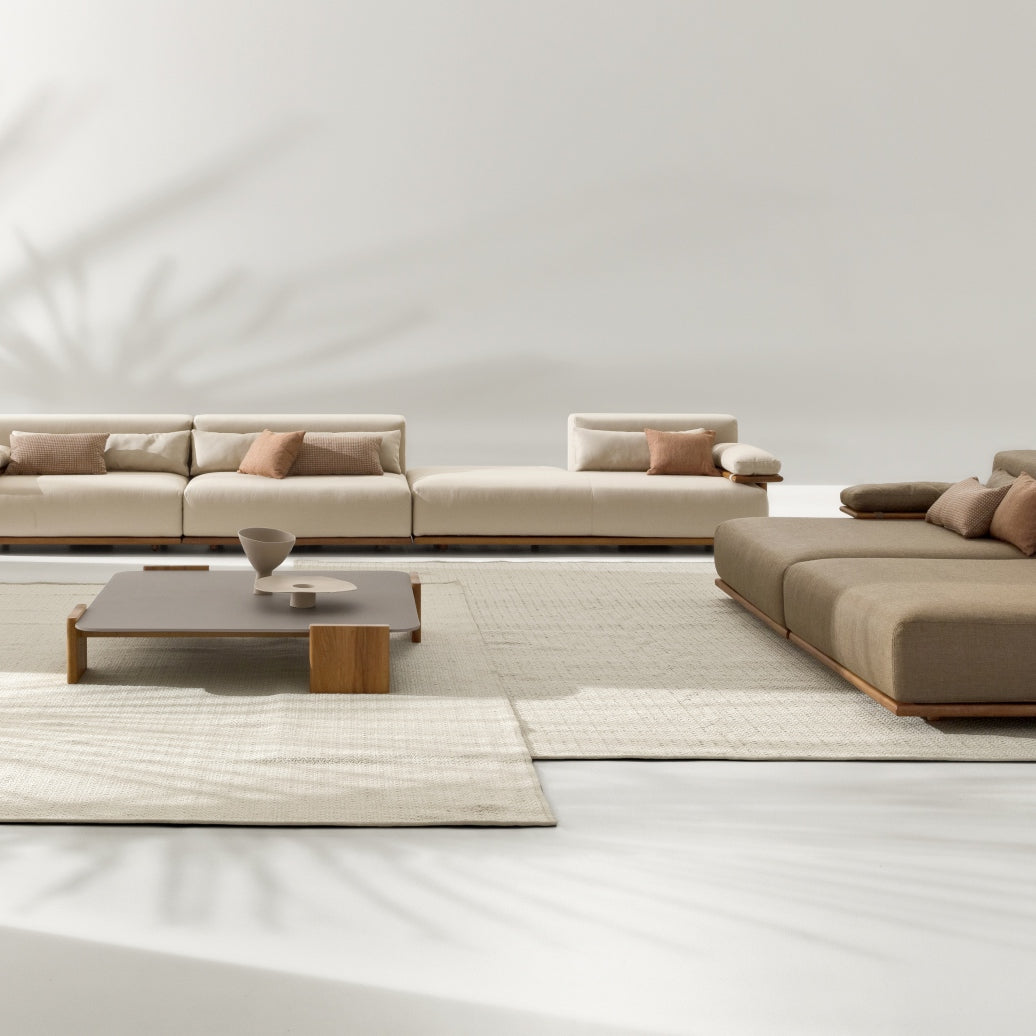Coffee tables with a marble, stoneware or hpl top and wood iroko legs.