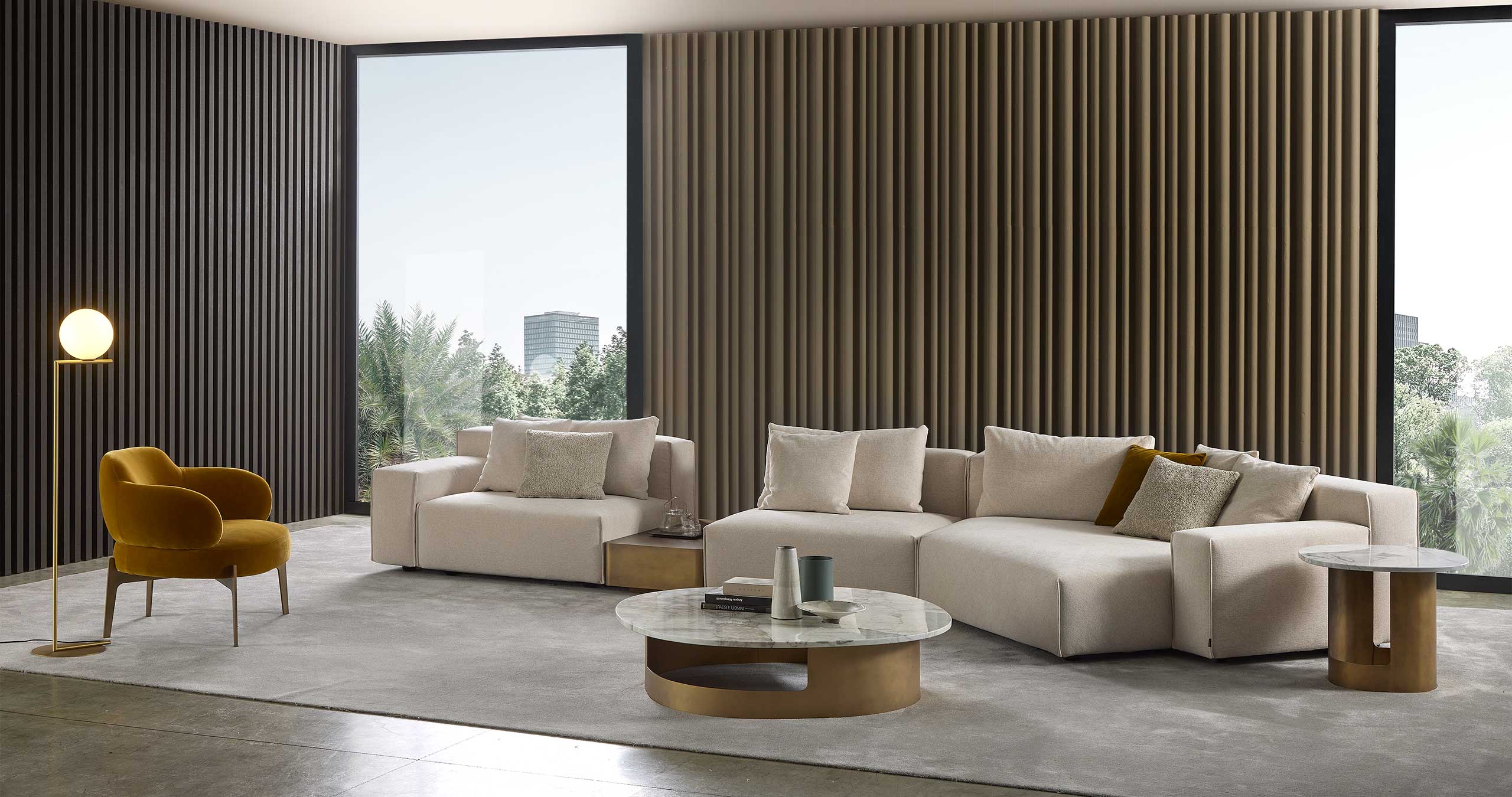 Yann is a very comfortable and versatile sectional sofa that offers the possibility of combining different shapes thanks to the presence of elements with non-right angles in the catalogue. Its modern and contemporary design makes it suitable for both residential and contract projects. Yann’s distinguishing features are its high comfort and attention to detail such as the edged seam on the upright.